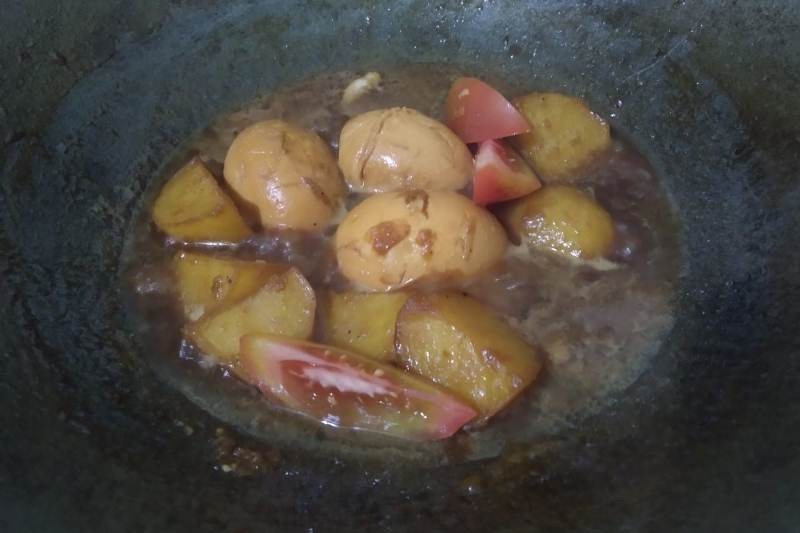 Kemudian kentang bisa ditambahkan sampai setengah matang saja kemudian telur rebus dimasukkan.